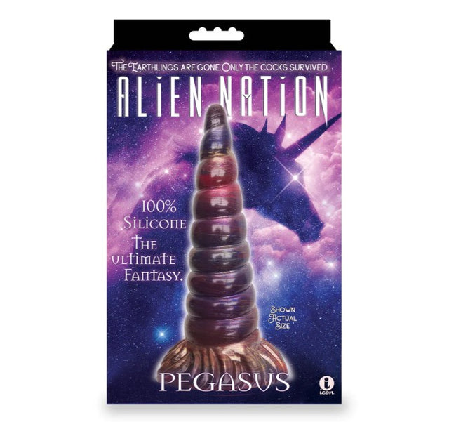 L'histoire de « Pégase » : Après la météorite, le règne animal a évolué vers des espèces jamais vues auparavant. Les créatures marines ont marché sur terre, les oiseaux ont navigué dans les océans et un cheval a pris son envol... il s'appellera Pégase, et Primus, stupéfait par sa beauté, lui a offert une corne de licorne en cuivre et en or, et tous les pouvoirs magiques qu'elle possédait ! Vous pouvez désormais avoir la corne de Pégase tant convoitée dans votre collection de jouets intimes, et être ébloui par sa palette tourbillonnante de pourpre et de cuivre, de violet et de vermillon, le tout dans une « rotation » chatoyante de silicone platine de qualité supérieure.