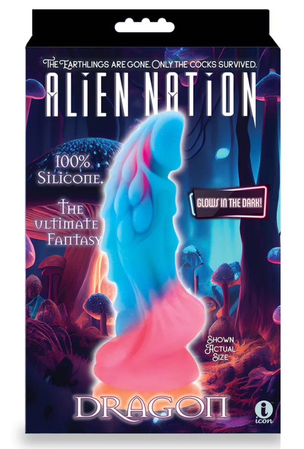 L'histoire du « Dragon » : Selon la légende, le Dragon fut créé à partir de pierre et de tempête, fruit de l'impact cataclysmique de l'astéroïde et du désir de Primus de créer une armée de bêtes aux écailles de serpent, aux serres d'aigle et aux pattes avant de lions… dont les pouvoirs surnaturels ne commençaient qu'avec la capacité d'illuminer la nuit d'une lueur irisée. Aujourd'hui encore, le Dragon brille dans l'obscurité, dans des teintes audacieuses de bleu, de violet, d'orange et de rouge ! Avec ses courbes sensuelles, ses grandes écailles en forme de goutte, ses crêtes de plaisir et son collier à picots, il vous stimulera de toutes les manières imaginables !