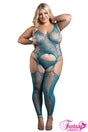 Bodystocking en dentelle fleurie avec des ouvertures en gros filet sur les côtés et au centre, de larges bretelles fixes élastiques et des bas assortis sans pieds rattachés par des jarretelles multi-sangles élastiques. (G-string assorti inclus)