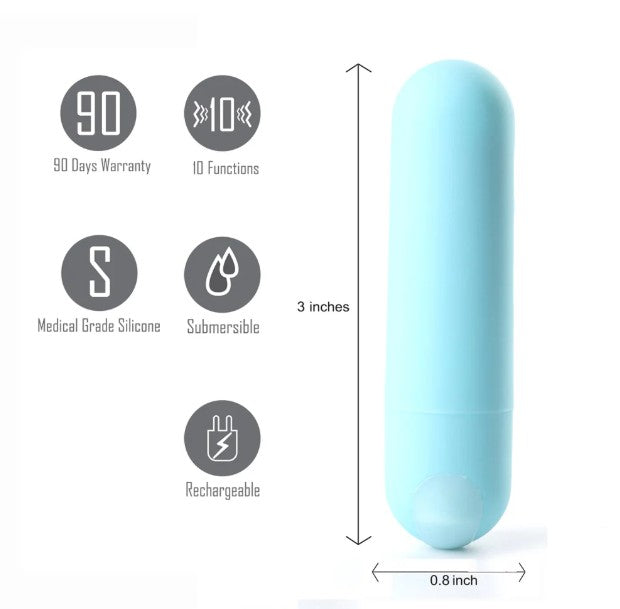 Le Maia Novelties Julia mesure 3 pouces de longueur et est env. ¾ pouces de large et comprend un câble de chargement USB. Tous nos produits rechargeables incluent notre garantie de remplacement d'un an.