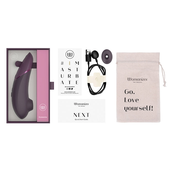 Le Womanizer Next est livré avec un câble de chargement USB (adaptateur secteur non inclus), un guide de démarrage rapide, des informations de conformité et de sécurité, une tête de stimulation supplémentaire et un autocollant #Imasturbate.