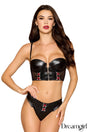 - Soutien-gorge allogé en tissu wet look extensible et lustré avec des bonnets cerclés rembourrés de mousse, au dos en mesh transparente, bretelles ajustables amovibles, une large taille satinée sous le buste et une fermeture éclair à l'avant