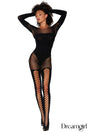 Bodystocking en filet avec un imprimé opaque ressemblant à un teddy, de longues manches comprenant des trous pour les pouces et aux jambes opaques entrouverts au lacé élastique fixe.