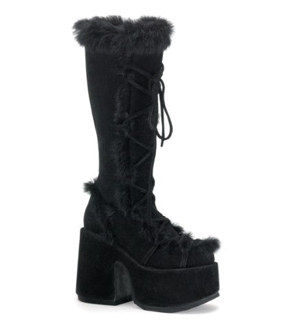 Bottes au genou à plateforme Goth Punk Gogo de 12,7 cm (5 po) avec doublure en fausse fourrure et détails sur la partie supérieure, fermeture latérale intérieure complète.
