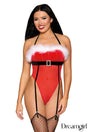 - Body en résille extensible transparente avec baleines rigides sur les bonnets en velours doux, col dos nu élastique réglable et amovible, bordure en fausse fourrure duveteuse, ceinture en velours avec boucle en strass, jarretelles réglables et fermeture à agrafes dans le dos.