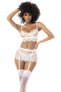 Un ensemble trois pièces en dentelle , comprenant un soutien-gorge avec armatures et bretelles réglables, porte-jarretelles et culotte assortie.