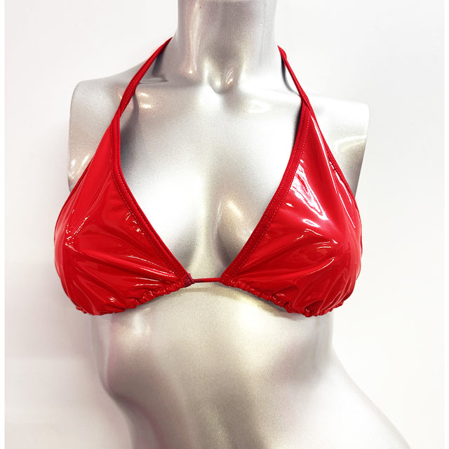 Ce haut de bikini triangulaire en PVC brillant est conçu pour mettre en valeur votre silhouette. Sa coupe flatteuse et son tissu luxueux vous assurent un confort optimal. Disponible en noir élégant ou rose vif audacieux.