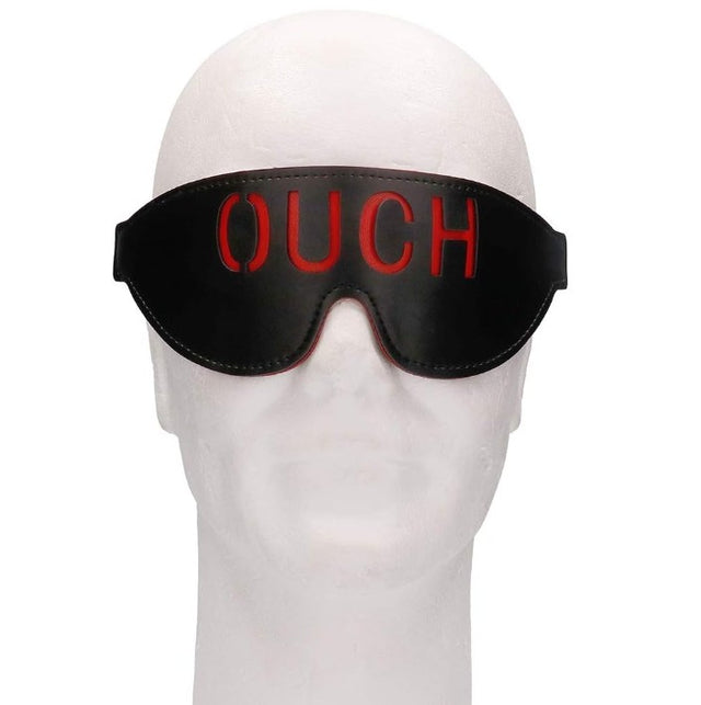 Gardez votre amoureux dans l'obscurité et au sommet de l'anticipation avec ce masque pour les yeux en cuir. Le mot OUCH est découpé et contre une couche rouge en cuir cousu.