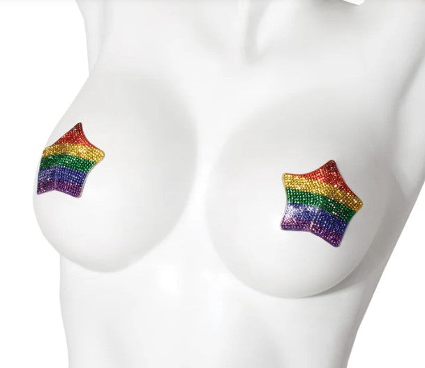 Ajoutez de l'éclat et de la couleur à votre look avec ces cache-tétons arc-en-ciel en forme d'étoile. Ornés de strass accrocheurs, ils sont conçus pour briller sous tous les angles. Dotés d'un dos auto-adhésif réutilisable, ces cache-tétons offrent un ajustement sûr, ce qui les rend parfaits pour les festivals, les fêtes ou un look lingerie.