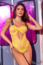 Teddy en dentelle à coupe thong avec "TROUBLE MAKER" imprimé sur les larges bretelles élastiques et deux fermetures à crochet : une au dos et une à la fourche