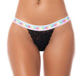 Thong en dentelle noire avec une large taille élastique comprenant un imprimé des pronoms désirés en lettrage arc-en-ciel