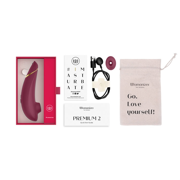 Le stimulateur clitoridien Womanizer PREMIUM 2 est livré avec un câble de charge USB (adaptateur non inclus), deux têtes de stimulation, un guide de démarrage rapide, des instructions de sécurité, une pochette de rangement en coton.
